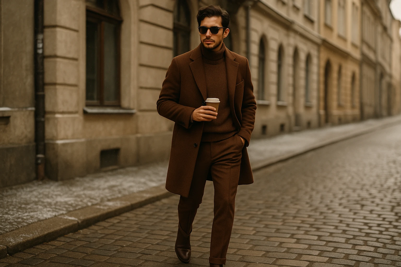 Monochromatic dressing creates instant sophistication. Wearing one color from head to toe in brown, black, navy, or grey makes you look taller and more polished. A chocolate brown overcoat with matching trousers and tonal sweater demonstrates advanced style awareness. The key is varying textures to prevent the look from feeling flat. Funnel neck sweaters have become the defining layering piece for winter. The high collar provides warmth without requiring a scarf, creating clean lines under coats. Grey funnel neck sweaters offer maximum versatility, pairing with dress trousers for work or jeans for weekends. For professional settings, wear with tailored trousers and Chelsea boots. For casual looks, pair with dark denim and minimal sneakers.